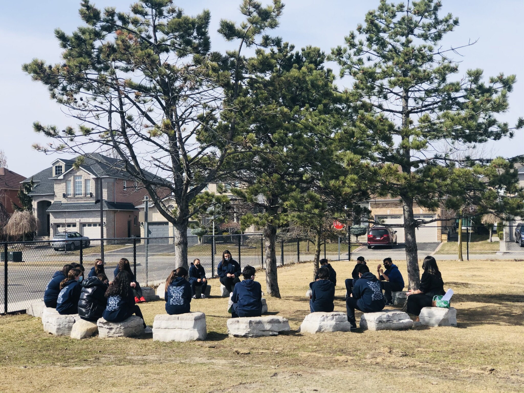 students sitting in circle in an outdoor field